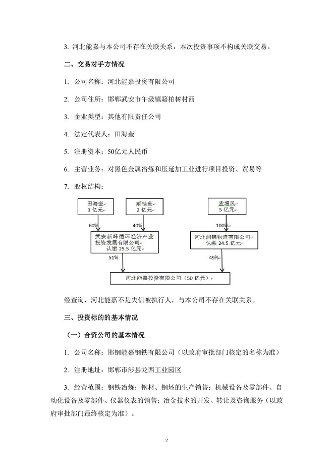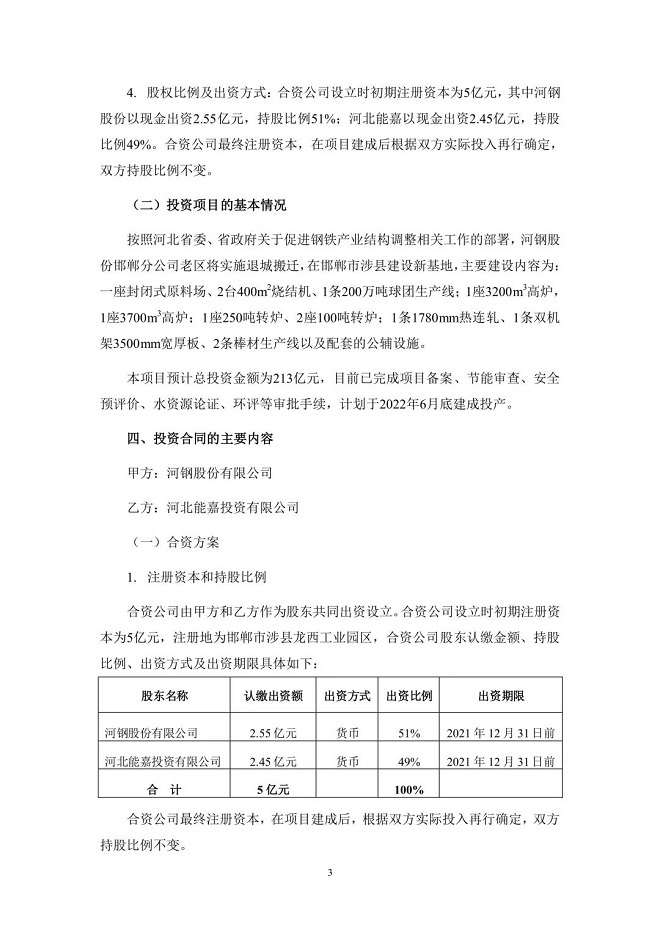 經協商,雙方確定合資公司持股比例為:河鋼股份持股51%,河北能嘉持股49%。合資公司初期注冊資本為5億元,按照約定的持股比例,河鋼股份以現金出資2.55億元,河北能嘉以現金出資2.45億元。合資公司最終注冊資本在項目建成後根據雙方實際投入,按照河鋼股份持股51%、河北能嘉持股49%的比例另行確定。