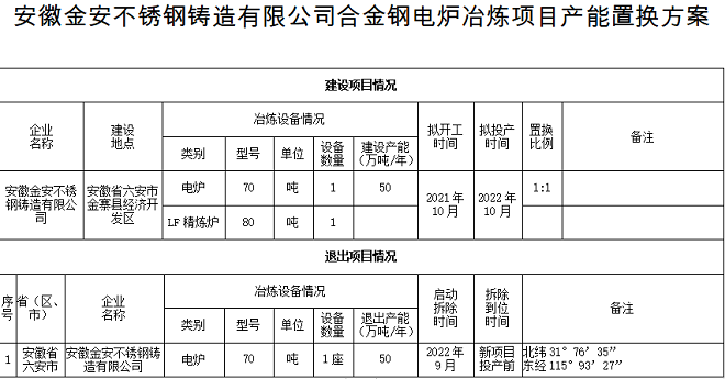 01安徽金安不鏽鋼鑄造有限公司合金鋼電爐冶煉項目產能置換方案