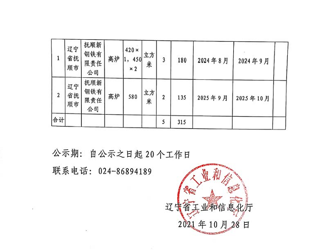 10月28日,遼寧省工信廳發布撫順新鋼鐵有限責任公司煉鐵高爐升級改造項目產能置換方案公示,其中,撫順新鋼鐵擬開工新建1200立方米高爐2座、CIP熔融還原爐1座,合計產能258.5萬噸。
