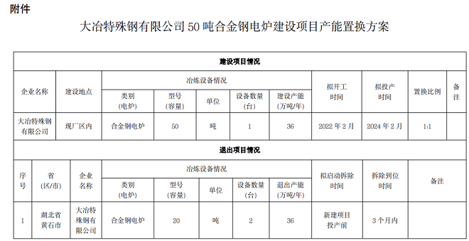 按照《國務院關於化解產能嚴重過剩矛盾的指導意見》《國務院關於鋼鐵行業化解過剩產能實現脫困發展的意見》和《鋼鐵行業產能能置換實施辦法》要求,經企業申請,屬地工業和信息化部門審核,以及具有冶金專業甲級資信等級的第三方評估,現將大冶特殊鋼有限公司50噸合金鋼電爐建設項目產能置換方案予以公示。