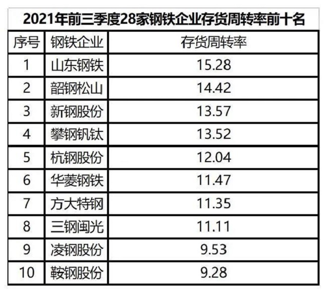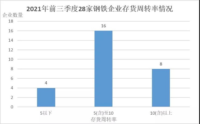 (一)營運能力持續向好。從存貨周轉率看,2021年前三季度28家鋼鐵企業平均存貨周轉率7.11,相較2020年同期增加1.65次,相較2021年上半年增加3.04次,存貨周轉速度持續加快。主要原因:一是鋼鐵供需基本平衡,鋼鐵產量大幅下降,推升了鋼材價格,營業收入增長明顯;二是三季度進口鐵礦石價格降幅顯著,較低的鐵礦石價格壓低了鋼鐵企業存貨餘額。