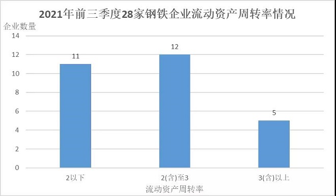 從流動資產周轉率看,2021年三季度28家鋼鐵企業平均流動資產周轉率2.24,相較2020年同期增加0.52次,相較2021年上半年增加0.77,平均流動資產周轉率處於合理區間,流動資金周轉狀況較好。較高的平均流動資產周轉率得益於鋼鐵產量得到控製、鋼材銷售價格上升,鋼鐵企業營業收入大幅增加,同時鐵礦石價格較低,盡管焦炭、煤炭價格漲幅較大,但綜合算賬營業成本總體降幅較大。較高的平均流動資產周轉率表明,28家鋼鐵企業的銷售狀況良好,下遊鋼材市場較為平穩。