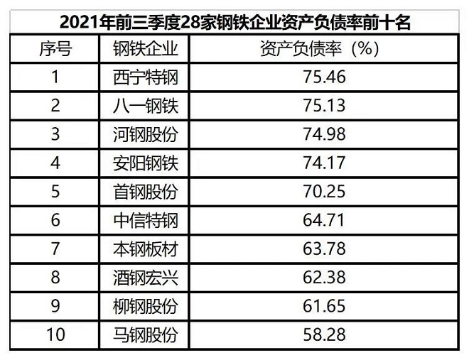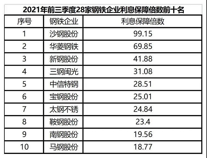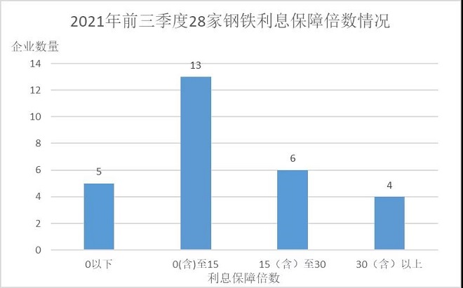 (二)償債能力穩步提升。從資產負債率看,2021年前三季度28家鋼鐵企業平均資產負債率為56.62%,比2020年同期下降0.82個百分點。據中國鋼鐵工業協會數據,截至今年9月末全國重點大中型鋼鐵企業資產負債率61.37%,28家鋼鐵企業的平均負債情況好於全國重點大中型鋼鐵企業平均水平,其中有19家企業資產負債率低於61.37%,有5家企業的資產負債率超過70%;從有息負債率看,2021年前三季度28家鋼鐵企業平均有息負債率為17.5%,比2020年同期下降2.57個百分點,反映出近兩年28家鋼鐵企業效益向好,對金融機構的信貸需求有所下降。