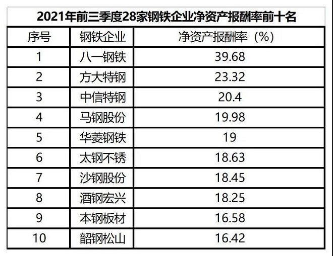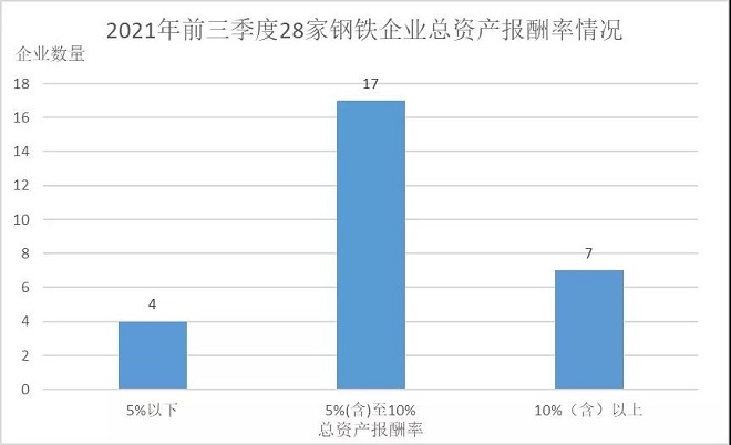 從資產報酬率看,2021年前三季度28家鋼鐵企業平均總資產報酬率為7.61%、淨資產報酬率為13.61%,較2020年前三季度分別增加3.95和7.76個百分點,較2021年上半年分別增加2.24和3.82個百分點,反映出鋼鐵企業盈利能力進一步增強。在28家鋼鐵企業中,分別有27家鋼鐵企業總資產報酬率、淨資產報酬率實現同比正增長,其中華菱鋼鐵總資產報酬率同比下降,西寧特鋼淨資產報酬率同比下降。