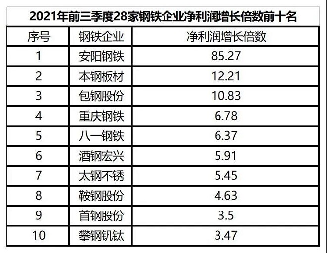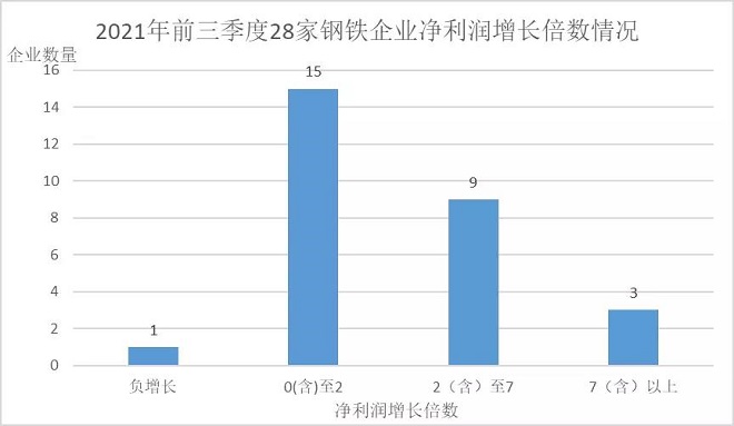 (四)發展能力明顯增強。從營業收入和淨利潤增長率看,28家鋼鐵企業2021年前三季度的平均營業收入較2020年同期增長51.29%,各家鋼鐵企業均實現了正增長,其中增長最快的是首鋼股份,同比增長率達到82.11%;平均淨利潤較2020年同期增長1.71倍。在28家鋼鐵企業中,有27家實現淨利潤同比正增長,僅有西寧特鋼一家企業淨利潤為負。