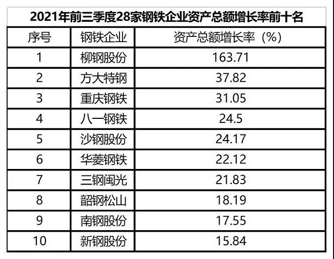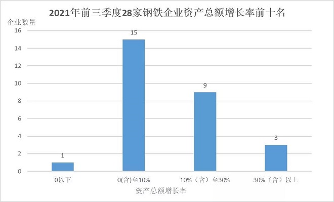從總資產增長率和資本保值增值率看,截至2021年9月30日,28家鋼鐵企業2021年平均總資產增長率為8.77%,高於2020年同期平均總資產增長率8.02%的水平;其中有24家鋼鐵企業實現了正增長,增長最快的是方大特鋼,增長率達到50.95%,有4家企業2021年總資產規模減少。28家鋼鐵企業前三季度平均資本保值增值率為109.8%,相較去年同期平均資本保值增值率增加了5.75個百分點,其中有25家鋼鐵企業淨資產實現了正增長。