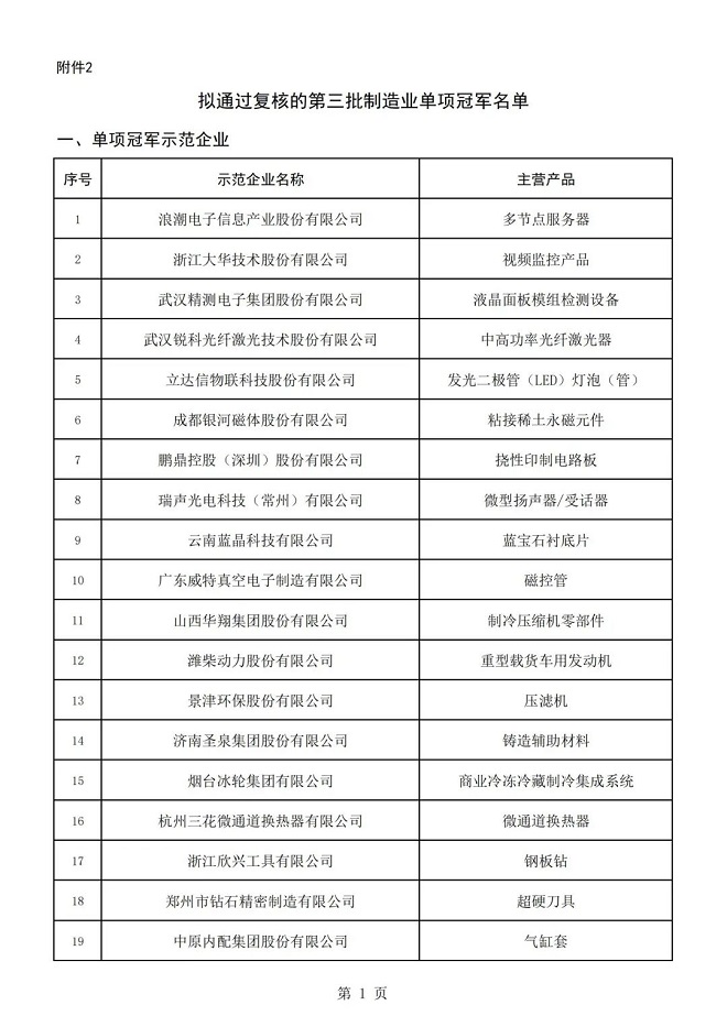 11月8日,工信部發布了《關於製造業單項冠軍第六批遴選和第三批通過複核企業名單的公示》(以下簡稱“《公示》”)。《公示》稱,根據《製造業單項冠軍企業培育提升專項行動實施方案》(工信部產業〔2016〕105號)、《工業和信息化部辦公廳 中國工業經濟聯合會關於組織推薦第六批製造業單項冠軍和複核第三批製造業單項冠軍的通知》(工信廳聯政法函〔2021〕95號),現將擬認定的第六批製造業單項冠軍和擬通過複核的第三批製造業單項冠軍名單予以公示,公示時間為2021年11月8日至11月15日。