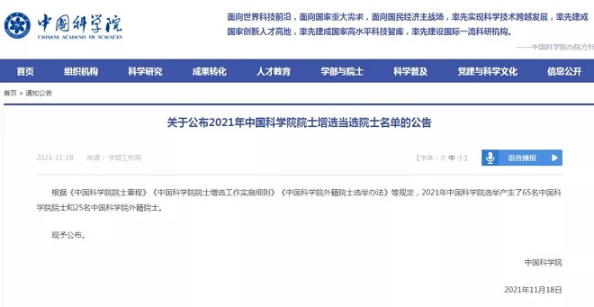 中國科學院根據《中國科學院院士章程》《中國科學院院士增選工作實施細則》《中國科學院外籍院士選舉辦法》等規定,於2021年選舉產生了65名中國科學院院士和25名中國科學院外籍院士。