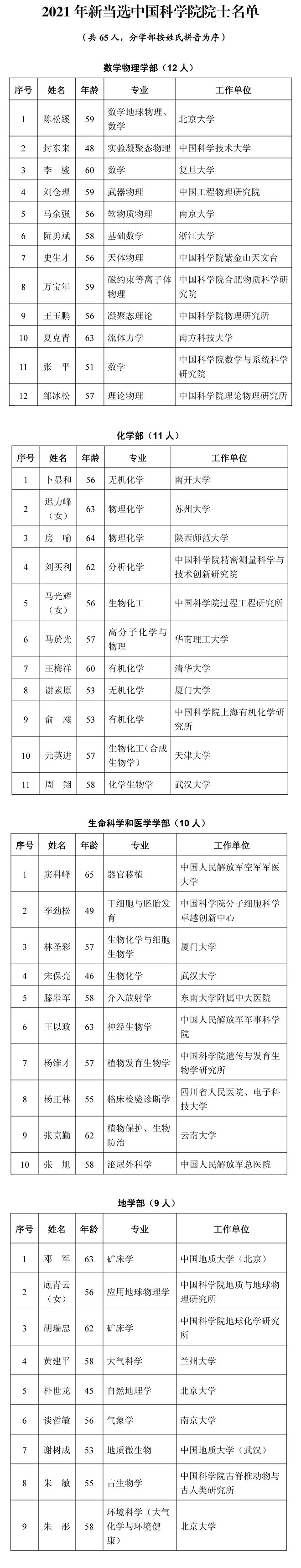 以下為中國科學院、中國工程院2021年當選院士完整名單: