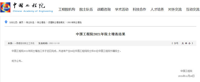 中國工程院發布了2021年院士增選結果,共選舉產生84位中國工程院院士和20位中國工程院外籍院士。