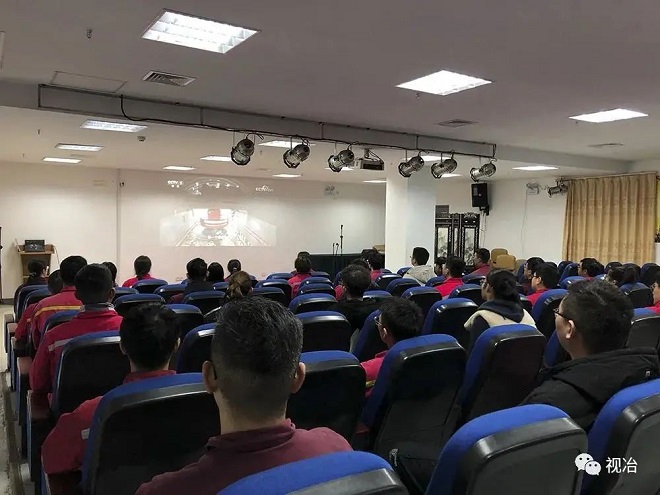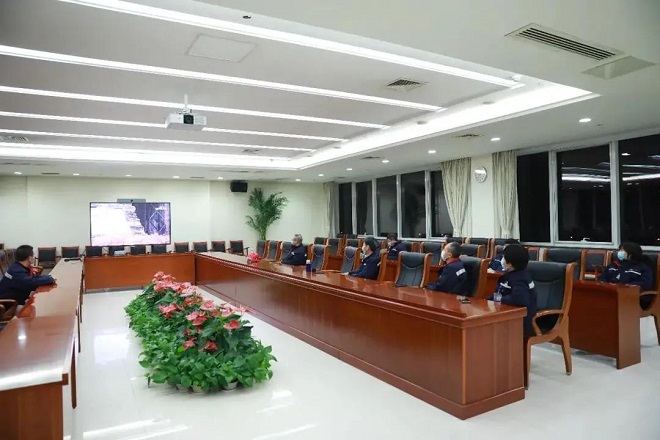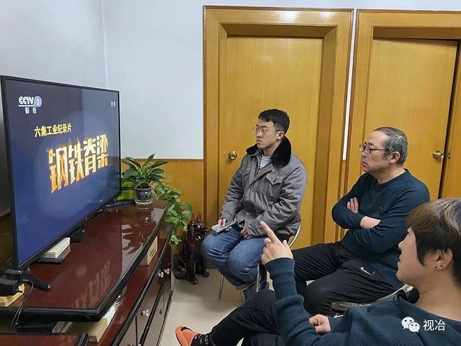 ▲新天鋼公司六樓西大會議室,新天鋼總經理闞永海、黨委書記張紀星帶領職工收看《鋼鐵脊梁》,並召開交流座談會