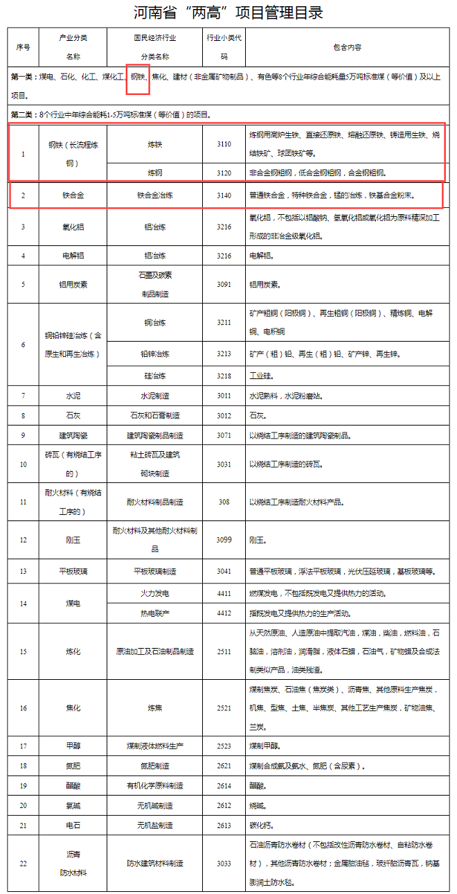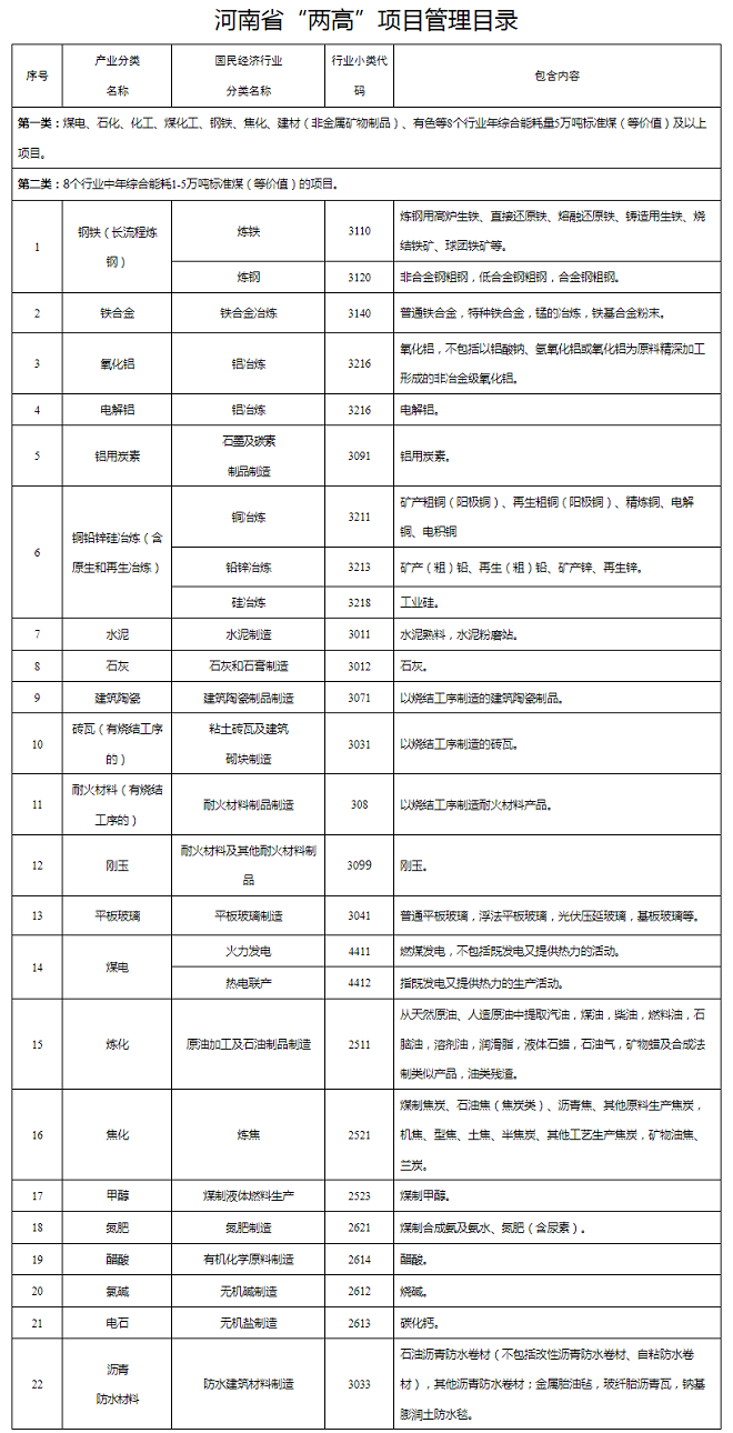 河南省參照外省經驗做法,結合河南省實際,建立了河南省“兩高”項目管理目錄。其中包括兩類:一是煤電、石化、化工、煤化工、鋼鐵、焦化、建材(非金屬礦物製品)、有色等8個行業年綜合能耗(等價值)5萬噸標準煤及以上的項目;二是8個行業中22個細分行業高耗能高排放環節年綜合能耗(等價值)1-5萬噸標準煤的項目,主要包括鋼鐵(長流程鋼鐵)、鐵合金、氧化鋁、電解鋁、鋁用碳素、銅鉛鋅矽冶煉(含原生和再生冶煉)、水泥、石灰、陶瓷、磚瓦(有燒結工序的)、耐火材料(有燒結工序的)、剛玉、平板玻璃、煤電、煉化、焦化(含蘭炭)、甲醇、氮肥、醋酸、氯堿、電石、瀝青防水材料等。其中,“十四五”新建“兩高”項目按新增能耗量計算,改建、擴建“兩高”項目(不含不涉及主體工程、未增加產能的技術改造項目)能耗量按改擴建後的年設計綜合能耗計算。