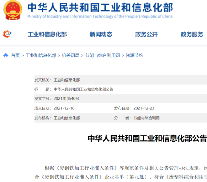 近日,工業和信息化部根據《廢鋼鐵加工行業準入條件》等規範條件及相關公告管理辦法規定,經專家審核、現場核查及網上公示等程序,將符合《廢鋼鐵加工行業準入條件》企業名單(第九批),以及變更、撤銷相關行業規範公告的企業名單予以公告。