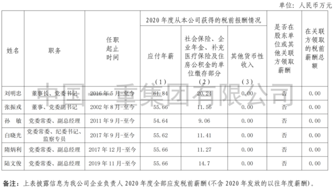 中國中鋼集團有限公司企業負責人2020年度薪酬情況