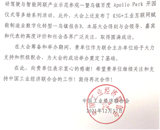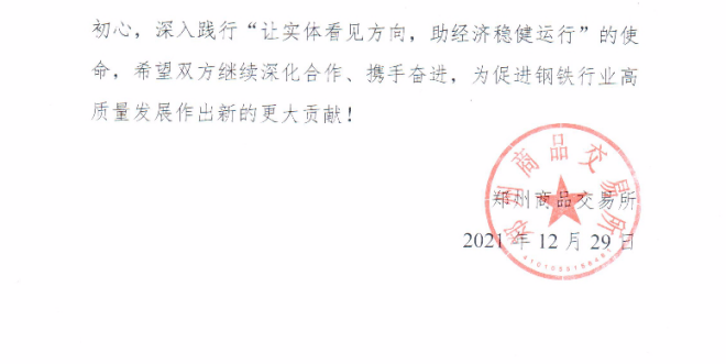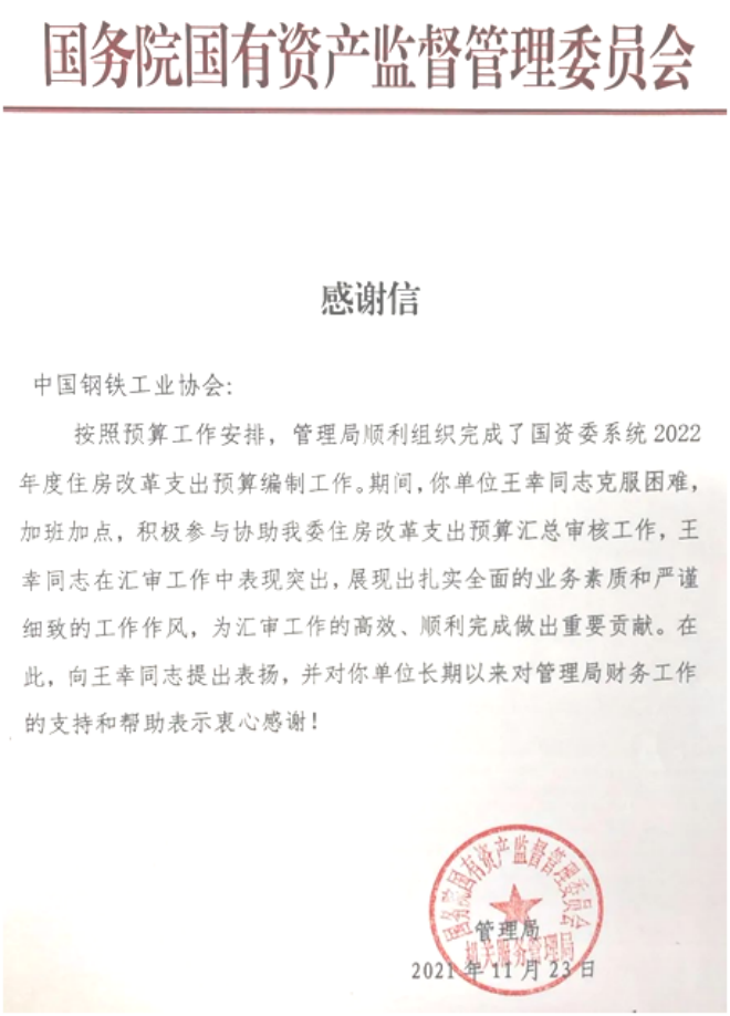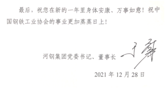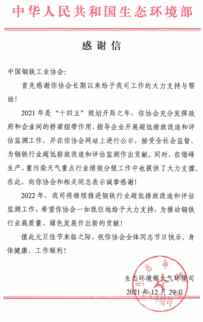 歲序更替,新元肇啟。歲末年初,工信部國家重大技術裝備辦公室、生態環境部大氣環境司、國資委管理局、中國工業經濟聯合會、河鋼集團、上海期貨交易所、鄭州商品交易所等向中國鋼鐵工業協會發來感謝信,對鋼協2021年在積極配合支持相關工作、凝聚行業發展共識、促進行業健康發展、支持規劃編製和政策研究、促進行業超低排放改造等方麵發揮的作用給予高度評價,對鋼協提供的大力支持表示誠摯感謝。