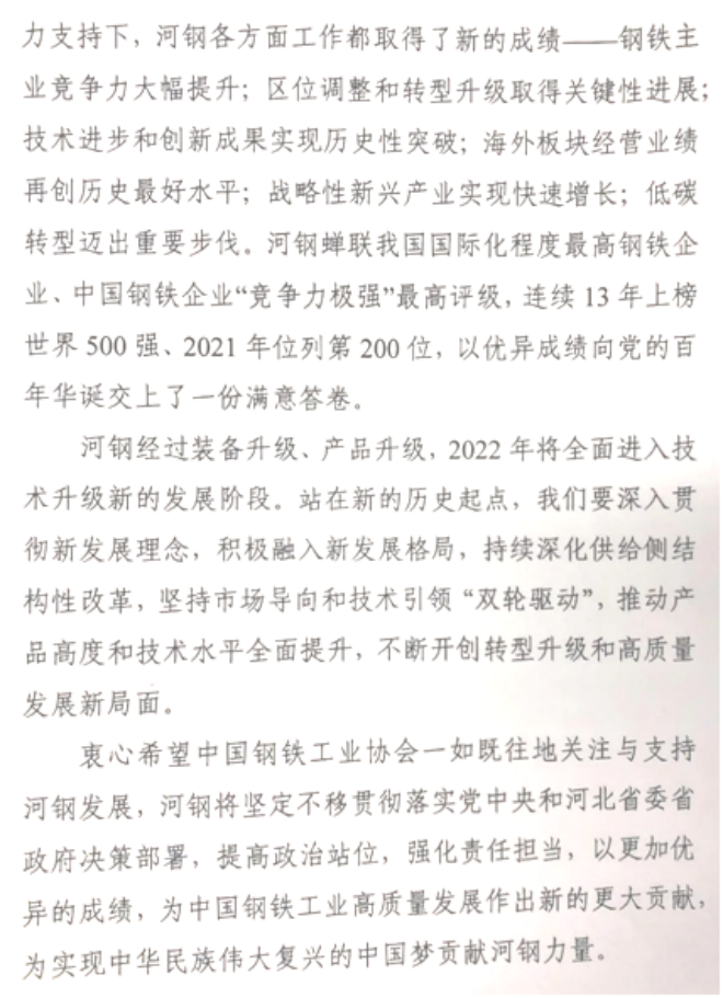 工信部、生態環境部、國資委、河鋼等向中國鋼鐵工業協會發來感謝信