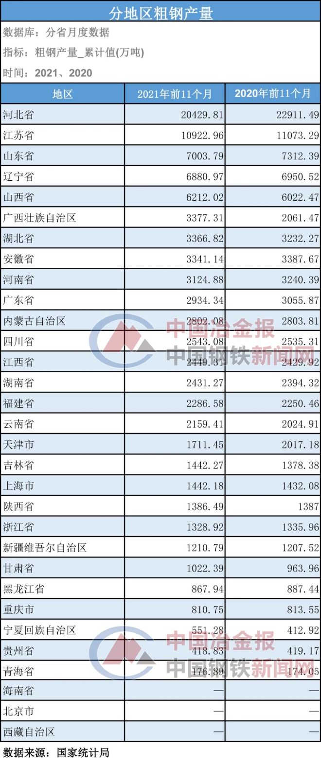 分地區來看,2021年前11個月,我國粗鋼產量排名前5位的省份分別為:河北省(20429.81萬噸)、江蘇省(10922.96萬噸)、山東省(7003.79萬噸)、遼寧省(6880.97萬噸)、山西省(6212.02萬噸)。具體情況見下表: