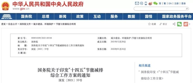 2022年1月24日,中華人民共和國中央人民政府網站發布了《國務院關於印發“十四五”節能減排綜合工作方案的通知》(以下簡稱“《通知》”)。