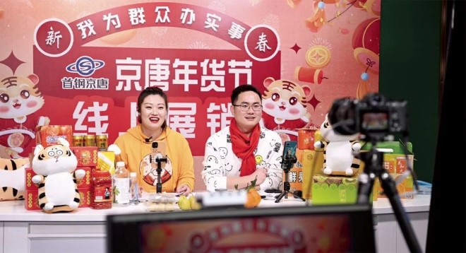 1月22日,首鋼京唐選取四大類28種優惠商品,利用首鋼京唐微信視頻號直播平台,采取線上購買、線下自提的方式直播購物,把最優惠的價格和最大的福利送給職工及家屬。活動中,共有5100多名職工觀看直播,1160多名職工線上采購到稱心的商品。(記者 楊立文 攝)