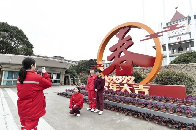 春節即將到來,為確保沙鋼幹部員工特別是留在江蘇張家港過年的職工度過一個歡樂、祥和的春節,沙鋼精心策劃係列暖心活動,營造出韻味十足的節日氛圍。圖為沙鋼職工紛紛與廠區裏的虎年春節主題景觀合影。(黃超/文 孫靜波 /攝)
