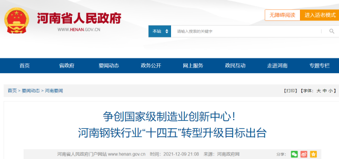2021年底,河南省人民政府網站發布了《河南省鋼鐵行業“十四五”轉型升級實施方案》(以下簡稱《方案》)。《方案》表示,到2025年,河南省鋼鐵行業綠色化、智能化、高端化、服務化水平進一步提升,生產力布局和產品結構進一步優化,生鐵產能控製在3000萬噸左右,粗鋼產能控製在4000萬噸以內,實現“兩減、兩降、兩優”目標。鋼鐵產能總量隻減不增,鋼鐵冶煉企業數量隻減不增。
