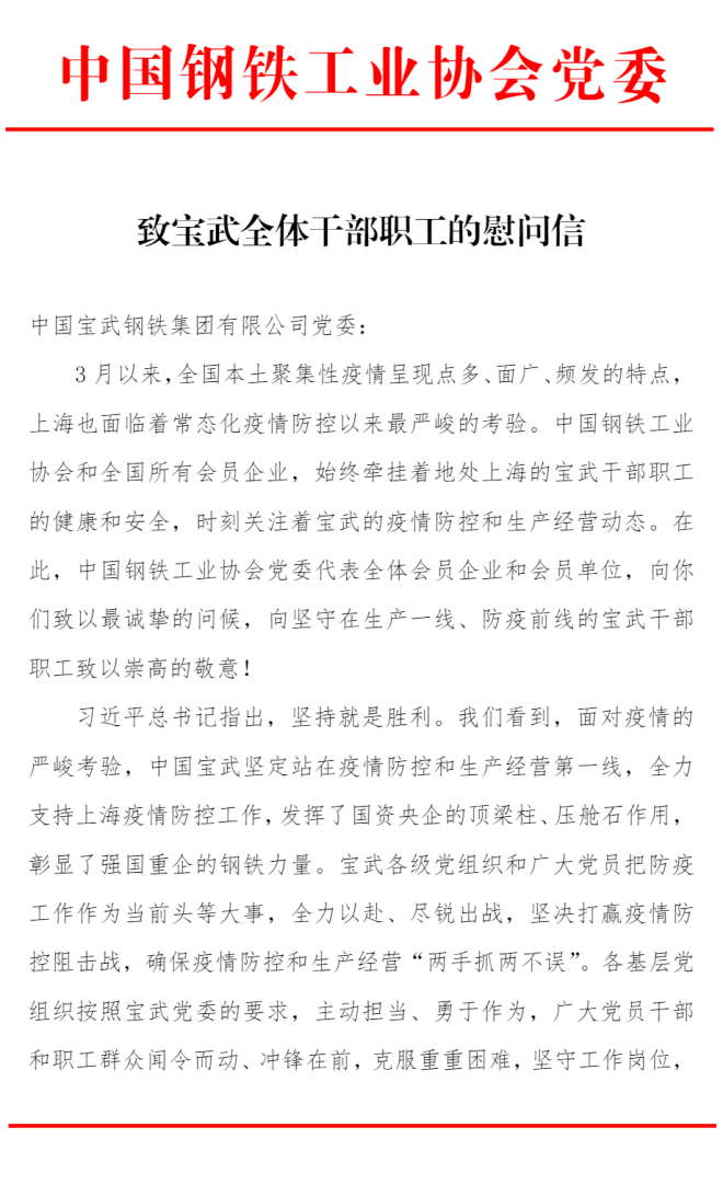 中國鋼鐵工業協會黨委致寶武全體幹部職工的慰問信