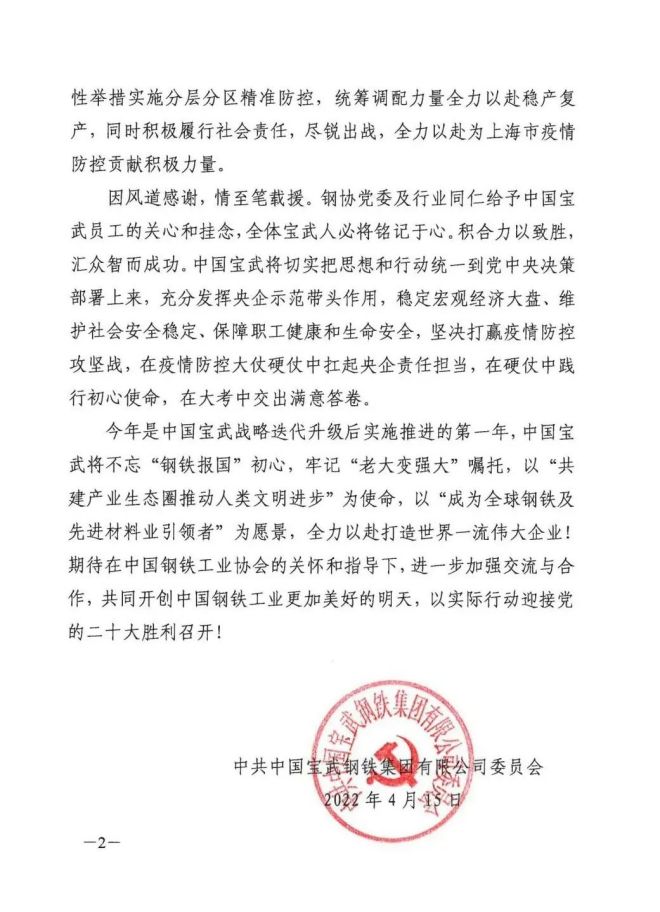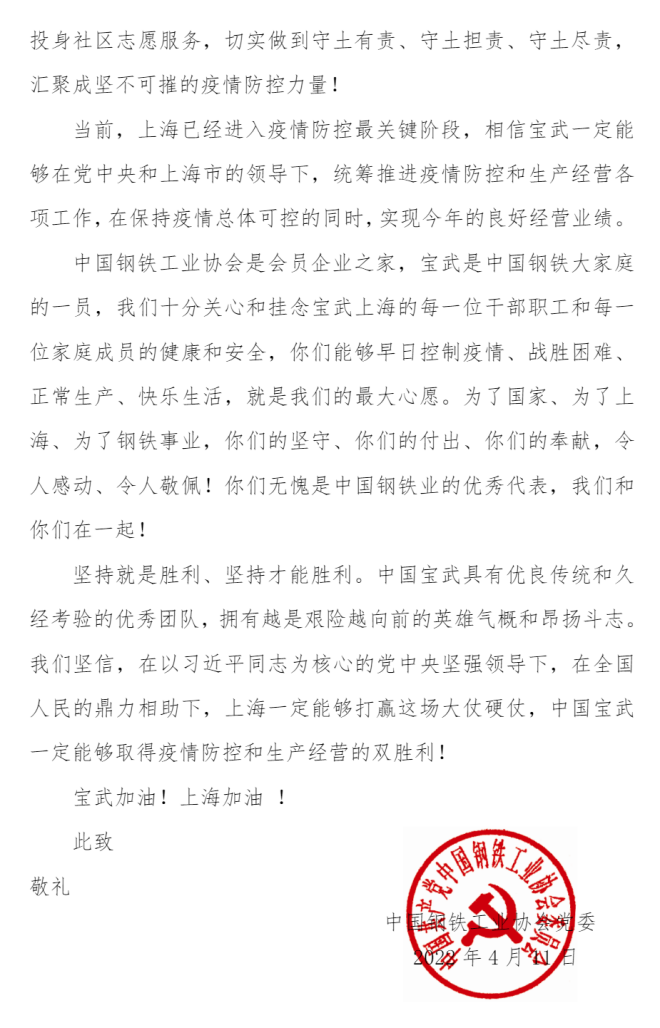 4月11日,中國鋼鐵工業協會黨委向中國寶武發去慰問信。