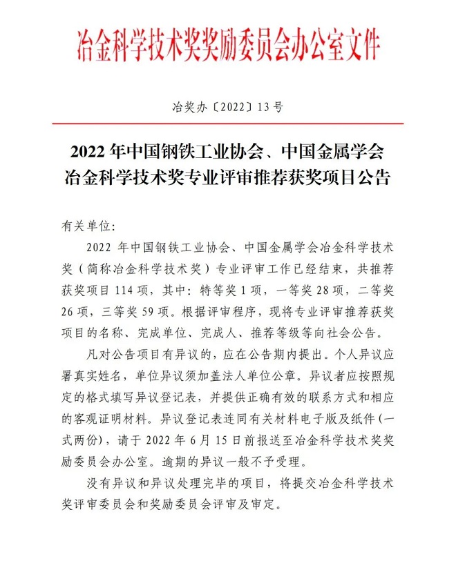 沒有異議和異議處理完畢的項目,將提交冶金科學技術獎評審委員會和獎勵委員會評審及審定。