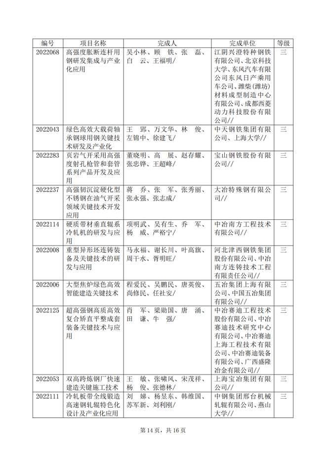 2022年中國鋼鐵工業協會、中國金屬學會冶金科學技術獎(簡稱冶金科學技術獎)專業評審工作已經結束,共推薦獲獎項目114項,其中:特等獎1項,一等獎28項,二等獎26項,三等獎59項。根據評審程序,現將專業評審推薦獲獎項目的名稱、完成單位、完成人、推薦等級等向社會公告。