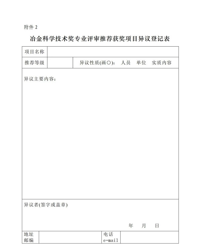 凡fan對dui公gong告gao項xiang目mu有you異yi議yi的de,應ying在zai公gong告gao期qi內nei提ti出chu。個ge人ren異yi議yi應ying署shu真zhen實shi姓xing名ming,單dan位wei異yi議yi須xu加jia蓋gai法fa人ren單dan位wei公gong章zhang。異yi議yi者zhe應ying按an照zhao規gui定ding的de格ge式shi填tian寫xie異yi議yi登deng記ji表biao,並bing提ti供gong正zheng確que有you效xiao的de聯lian係xi方fang式shi和he相xiang應ying的de客ke觀guan證zheng明ming材cai料liao。異yi議yi登deng記ji表biao連lian同tong有you關guan材cai料liao電dian子zi版ban及ji紙zhi件jian(一式兩份),請於2022年6月15日前報送至冶金科學技術獎獎勵委員會辦公室。逾期的異議一般不予受理。