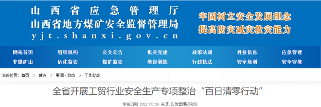 日前,山西省應急管理廳網站發布了《全省開展工貿行業安全生產專項整治“百日清零行動”》通知,決定於2022年6月初至9月上旬在全省開展工貿行業安全生產專項整治“百日清零行動”。