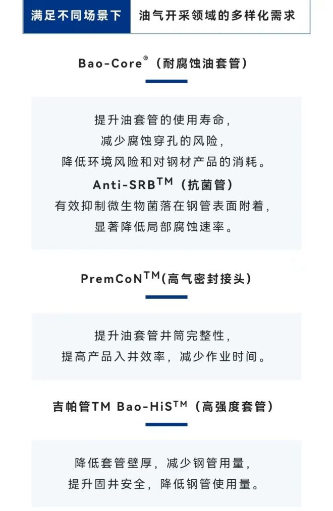 從被“卡脖子”到突破“卡脖子”,再到實現國產化;從無法生產到實現全流程一貫製生產,再到根據不同井況為用戶量身定製性價比最優產品、提供一攬子解決方案;從最初的單一產品到形成係列產品,再到形成擁有8個具備自主知識產權產品牌號的“大家族”;從誕生時就嵌入“低碳基因”到全生命周期踐行減排降碳……它帶著“Baosteel”這一標誌,走進了全球用戶油氣田開發現場,成為強腐蝕性油氣田開采和儲氣庫建設的“安全使者”和支撐大型油氣田突破產量紀錄的“品牌大使”。10多年來,寶鋼股份超級馬氏體不鏽鋼油套管(下稱超級13Cr油套管)不斷取得突破,具備了超強抗腐蝕能力和穩定高效的交付能力。