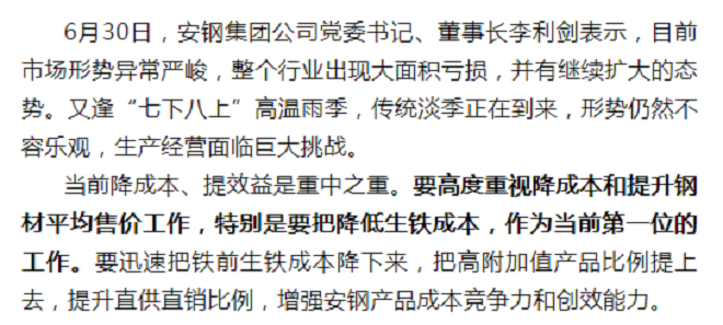 會議要求,集團上下必須充分認清當前形勢,思想上從過“好日子”向“緊日子”“苦日子”快速轉變,采取果斷有力措施,堅定信心,丟掉幻想,狠抓執行,戰危機保生存。不管任何情況下,要保鐵前生產穩定,保鋼後結構調整,保證集團公司盈利水平在行業平均“生命線”之上。強化以市場為導向的理念,虧損產品不生產,微利產品要限產。銷售部門要全員出動搶訂單,提升有效益的品種增量。重點推進進口礦、煉焦煤等大宗原燃料互給互補,在維持正常生產的情況下,確保全集團原燃料庫存降至最低。持續提高生產組織能力,全麵降低產成品、半成品庫存等。