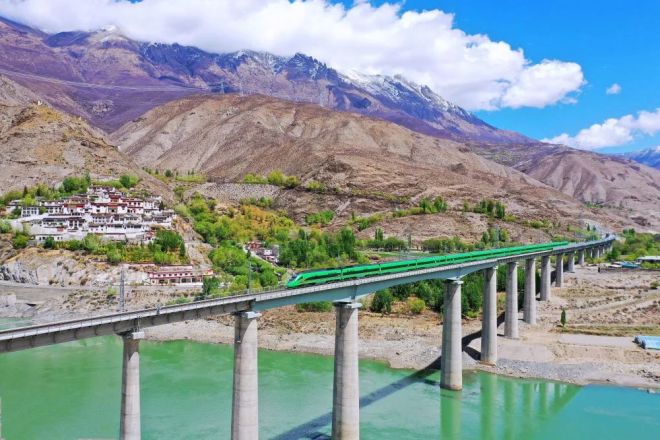 複興號列車行駛在西藏朗縣境內(2022年4月14日攝)。新華社記者 覺果 攝