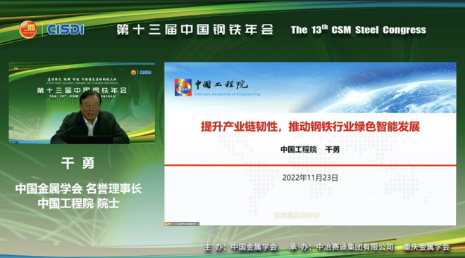 11月23日上午,由中國金屬學會主辦、中冶賽迪集團有限公司和重慶金屬學會承辦的第十三屆中國鋼鐵年會開幕。受疫情影響,本次會議采用線上方式進行,會期共2天。與會人士圍繞“建設綠色、低碳、智能、可持續發展的鋼鐵工業”主題,就冶金和材料理論、工藝、產品、應用、智能化、綠色化、低碳發展等內容展開交流研討。