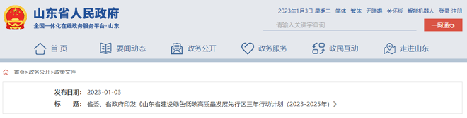 1月3日,山東省委、省政府印發《山東省建設綠色低碳高質量發展先行區三年行動計劃(2023—2025年)》,並發出通知,要求各級各部門各單位結合實際認真貫徹落實。