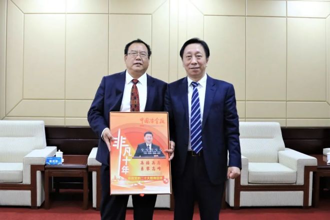 開幕式後,陳玉千向於勇贈送中國冶金報《非凡十年》二十大百版特刊