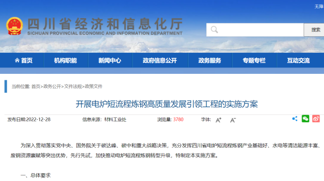 2022年12月28日,四川省經濟和信息化廳網站發布了《開展電爐短流程煉鋼高質量發展引領工程的實施方案》(以下簡稱《方案》)。