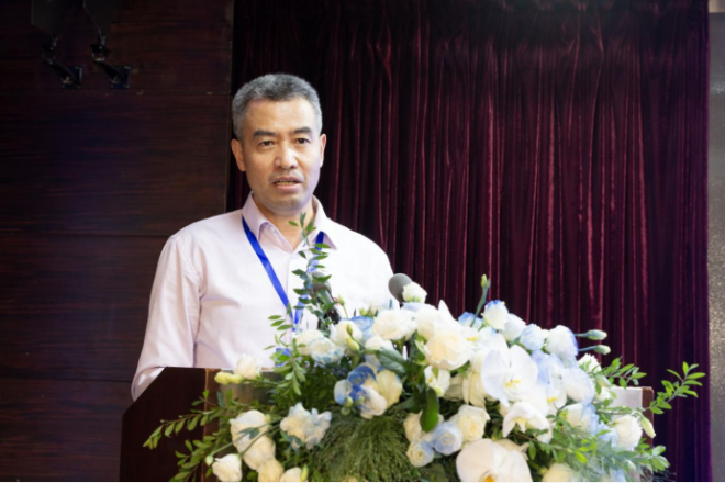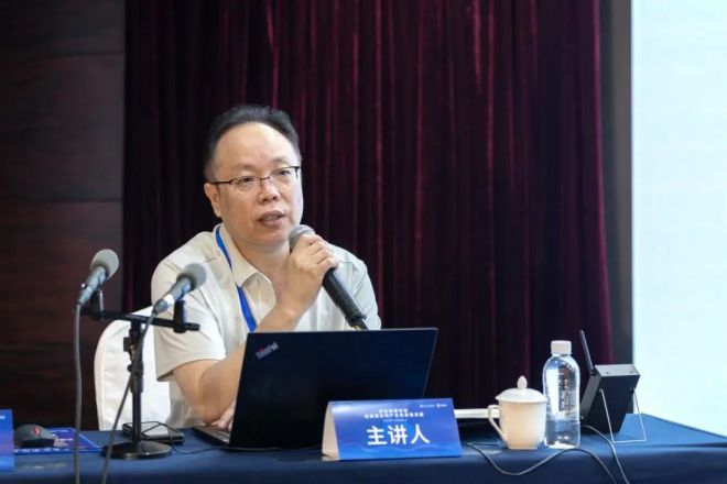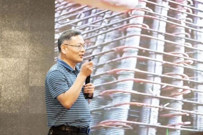 圖為廣西建工智慧製造公司董事長李長國作題為《鋼筋深加工發展過程中的困擾與對策探討》的學術報告。