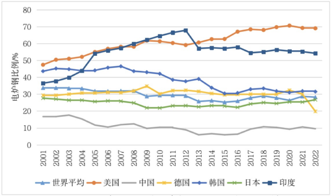 圖1 2001—2022年世界主要產鋼國電爐鋼產量占比的變化