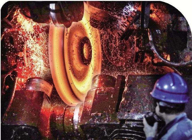 圖為馬鋼生產的地鐵車輪進入軋製工序。(王文生攝)