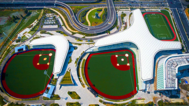 紹興棒(壘)球(qiu)體(ti)育(yu)文(wen)化(hua)中(zhong)心(xin)設(she)計(ji)以(yi)紹(shao)興(xing)的(de)紡(fang)織(zhi)與(yu)絲(si)帶(dai)為(wei)切(qie)入(ru)點(dian),讓(rang)建(jian)築(zhu)和(he)平(ping)台(tai)以(yi)絲(si)帶(dai)的(de)形(xing)態(tai)將(jiang)各(ge)個(ge)場(chang)館(guan)聯(lian)係(xi)起(qi)來(lai),並(bing)與(yu)城(cheng)市(shi)街(jie)道(dao)相(xiang)連(lian)接(jie),成(cheng)為(wei)街(jie)道(dao)網(wang)絡(luo)的(de)一(yi)部(bu)分(fen)。同(tong)時(shi)將(jiang)綢(chou)帶(dai)、書卷、瓦頂等的曲線元素運用到建築立麵上,喚起民眾對地域文化的集體記憶。