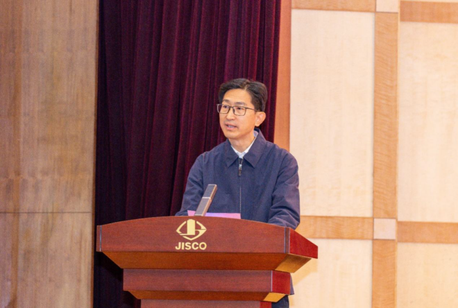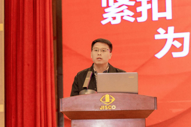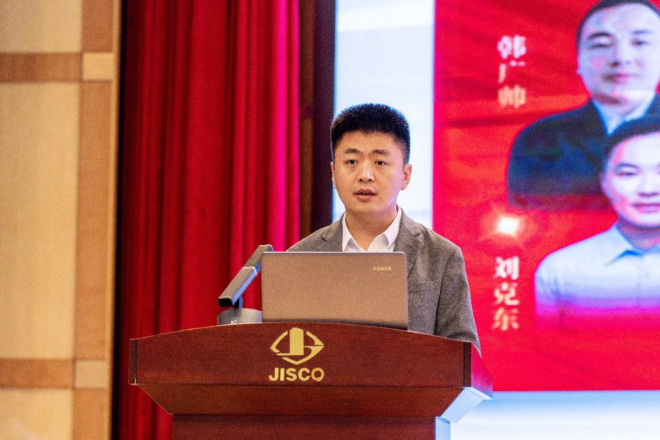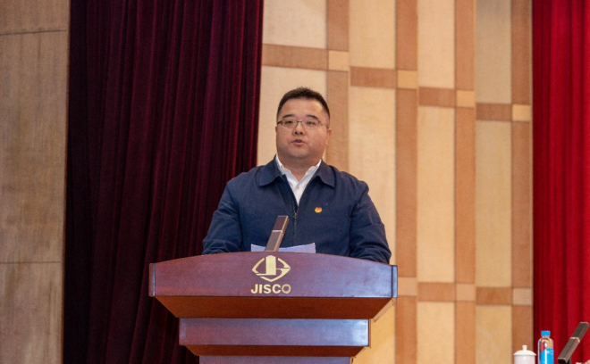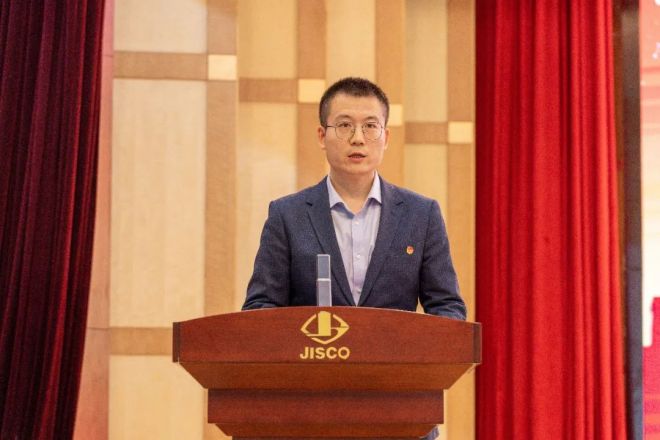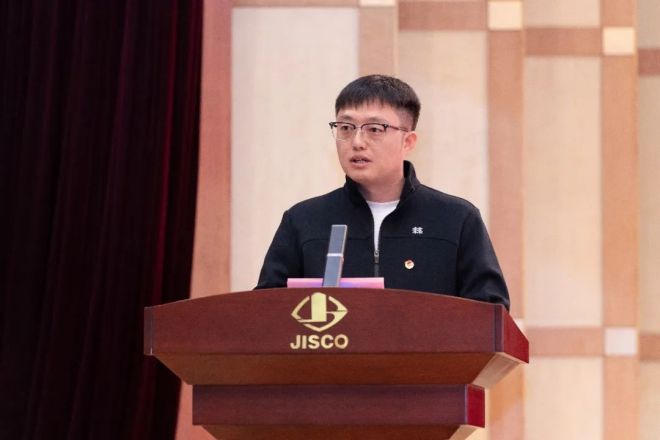 圖為金占雄作題為《聚焦企業戰略目標,創新人才工作機製,用青年力量“火種”點燃酒鋼高質量發展“引擎”》的主旨報告
