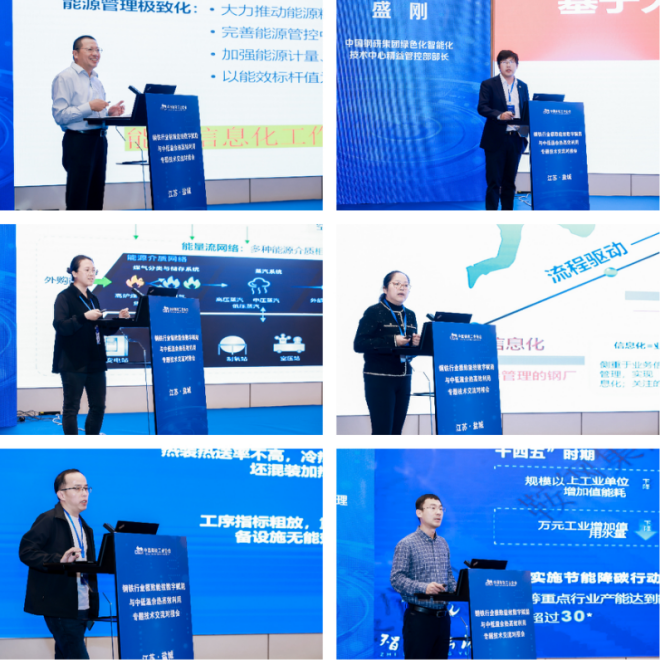 會議分數字賦能極致能效、中低溫餘熱高效利用兩個專場進行了技術交流。在數字賦能極致能效專場,原寶武集團能環部副部長戴堅、中國鋼研集團綠色化智能化技術中心精益管控部部長盛剛、中冶賽迪信息能源產品線負責人史春燕、寶信軟件高級總監汪晶、金恒科技智能化事業部技術副總監史振宇、鞍鋼信息化事業部能環產品部副經理王亞騰分別作主題發言,探討了如何利用數字化、信息化推動行業極致能效工作的開展。在中低溫餘熱高效利用專場,湖南中冶長天節能環保技術有限公司副總經理楊本濤、中冶南方工程技術有限公司高級設計師劉潔、建龍集團撫順新鋼鐵製造管理部主任李洪雨、哈爾濱工大金濤科技股份有限公司總經理李偉、遠大空調節能院院長匡勝嚴、上海能環實業有限公司總經理徐世洋分別作主題發言,交流了實現中低溫高效利用的技術路徑和解決方案。