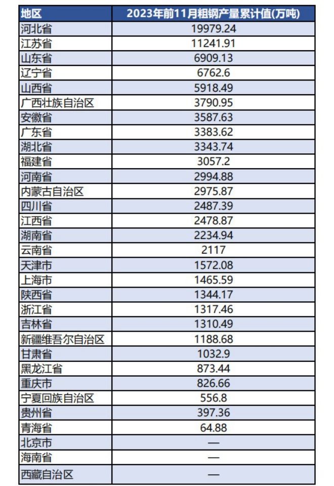 從地區來看,2023年前11個月,我國粗鋼產量排名前5位的省份分別為:河北省(19979.24萬噸)、江蘇省(11241.91萬噸)、山東省(6909.13萬噸)、遼寧省(6762.6萬噸)、山西省(5918.49萬噸)。具體情況見下表: