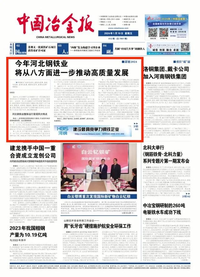 2023年(nian),河(he)北(bei)鋼(gang)鐵(tie)與(yu)全(quan)國(guo)鋼(gang)鐵(tie)行(xing)業(ye)一(yi)同(tong)在(zai)錯(cuo)綜(zong)複(fu)雜(za)的(de)市(shi)場(chang)變(bian)幻(huan)中(zhong)艱(jian)難(nan)跋(ba)涉(she),在(zai)三(san)重(zhong)疊(die)加(jia)的(de)壓(ya)力(li)衝(chong)擊(ji)下(xia)砥(di)礪(li)前(qian)行(xing)。過(guo)去(qu)的(de)一(yi)年(nian),河(he)北(bei)鋼(gang)鐵(tie)行(xing)業(ye)牢(lao)牢(lao)把(ba)握(wo)“鋼鐵向材料、製造向服務”轉型發展的關鍵窗口期,按照“六化”(安全化、綠色化、差異化、精品化、高端化、數智化)全力延鏈、補鏈、強鏈,逐步實現產品和模式錯位差異化,從而實現了行業運行穩中有升、鋼企健康運營。