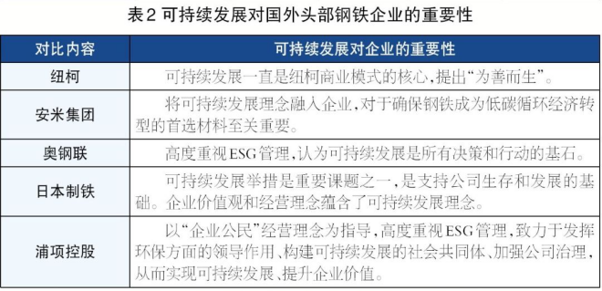 5家國外頭部鋼鐵企業均高度重視ESG管理,將可持續發展理念融入企業發展戰略、日常經營中,ESG在各企業中的重要性如表2所示。