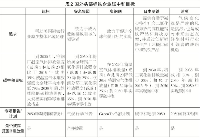 第一,設定碳減排目標。5家國外頭部鋼鐵企業均設定了中期和長期碳減排目標,將氣候風險評估及戰略納入整體業務規劃,並製訂了全麵、詳細的減排路徑,助力實現碳中和目標。5家國外頭部鋼鐵企業碳中和目標如表2所示。