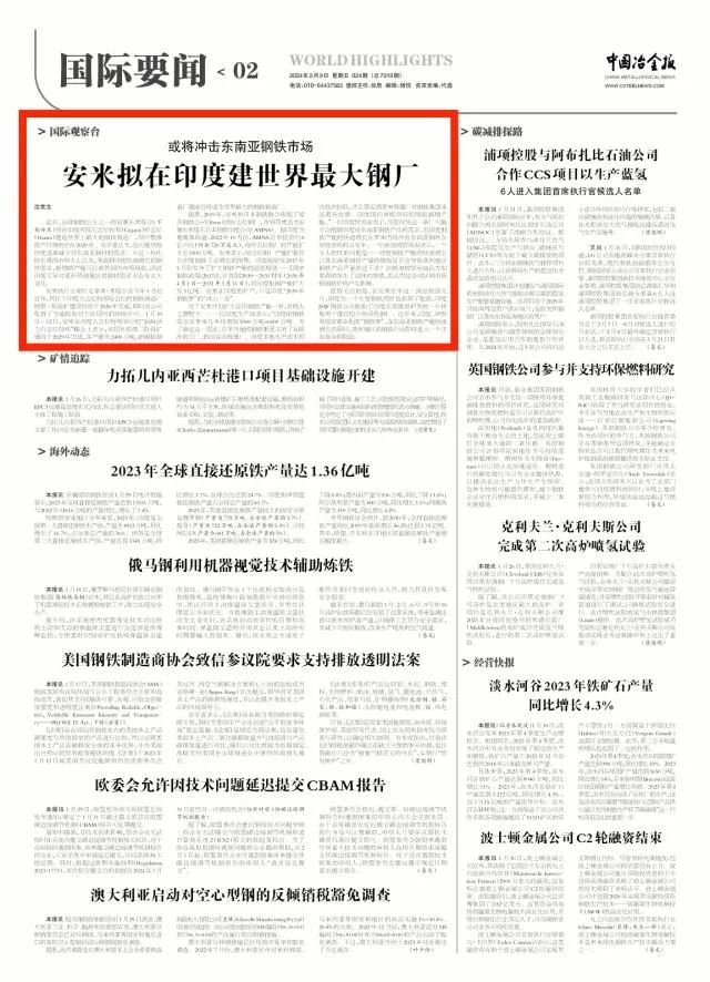 安米執行主席拉克希米·米塔爾在今年1月初宣布,其位於印度古吉拉特邦哈吉拉的鋼鐵製造廠的第一階段擴建項目將於2026年完成,同時該公司收到了當地政府對於該項目的環保許可。1月10日—12日,安米在印度古吉拉特邦舉行的“2024活力古吉拉特邦”峰會上表示,該項目的第二階段擴建將於2029年完成,年產能為2400萬噸,新鋼鐵製造廠建成後將成為世界最大的鋼鐵製造廠。