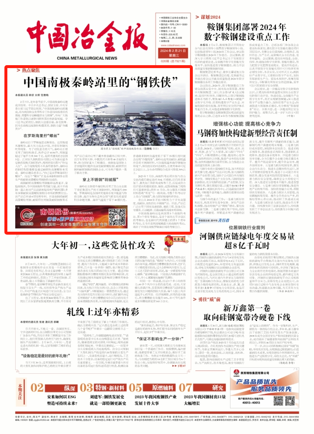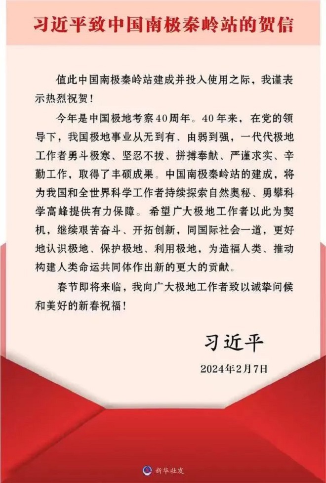 2月7日,龍年春節前夕,中國南極秦嶺站建成並投用。中共中央總書記、國家主席、中央軍委主席習近平致信祝賀,“中國南極秦嶺站的建成,將為我國和全世界科學工作者持續探索自然奧秘、勇攀科學高峰提供有力保障”,並bing向xiang廣guang大da極ji地di工gong作zuo者zhe致zhi以yi誠cheng摯zhi問wen候hou和he美mei好hao的de新xin春chun祝zhu福fu。學xue習xi總zong書shu記ji的de賀he信xin,鋼gang鐵tie人ren倍bei感gan自zi豪hao,備bei受shou鼓gu舞wu。因yin為wei在zai南nan極ji這zhe座zuo鋼gang結jie構gou建jian築zhu裏li,鋼gang鐵tie力li量liang“身藏其中”。